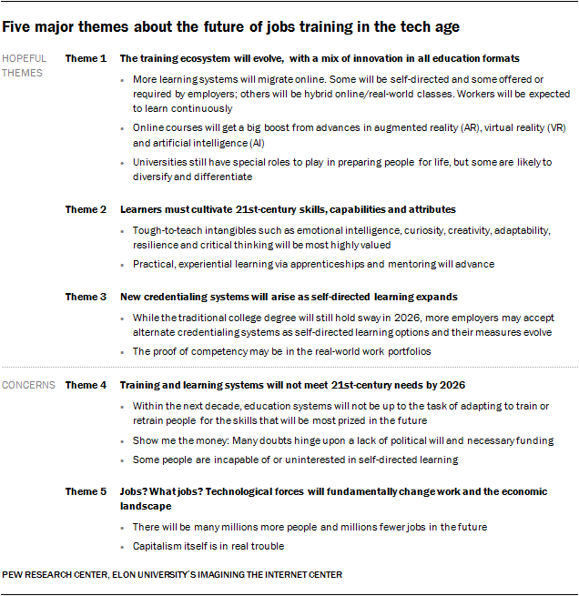 A diversifying education and credentialing ecosystem: Most of these experts expect the education marketplace – especially online learning platforms – to continue to change in an effort to accommodate the widespread needs. Some predict employers will step up their own efforts to train and retrain workers. Many foresee a significant number of self-teaching efforts by jobholders themselves as they take advantage of proliferating online opportunities.